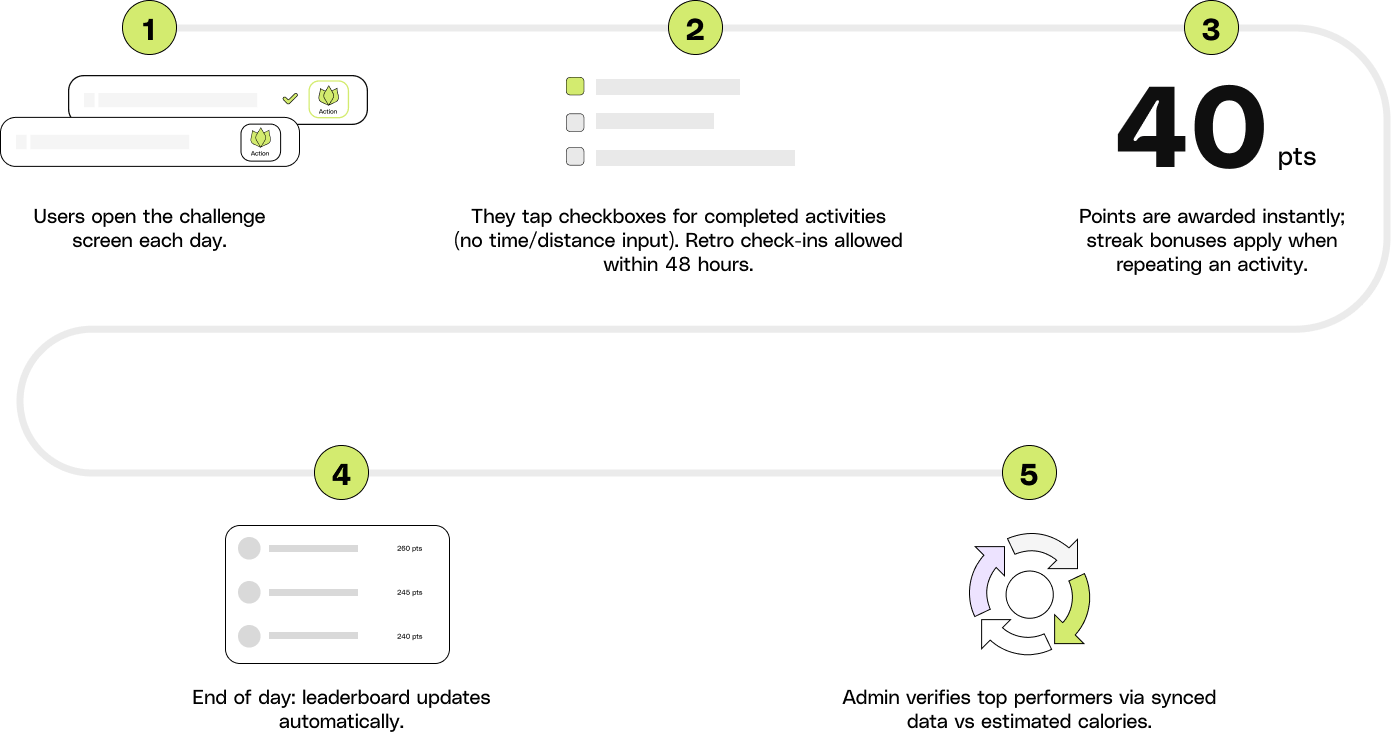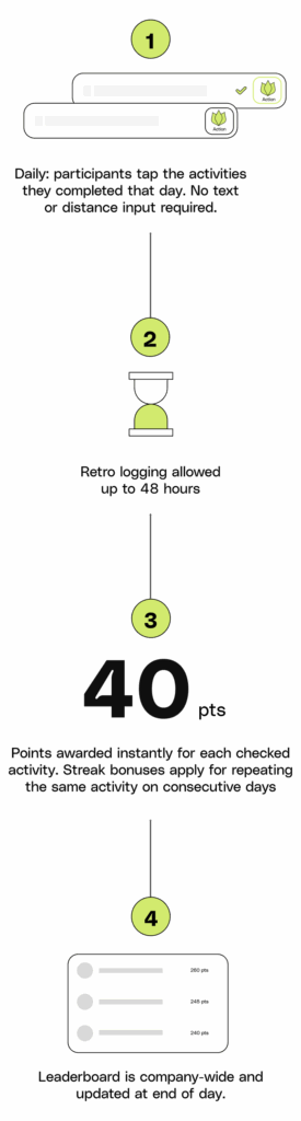 A low-friction, daily self-check-in challenge that boosts activity and engagement across your company. Users log which template activities they completed each day. The company-wide leaderboard encourages friendly competition.